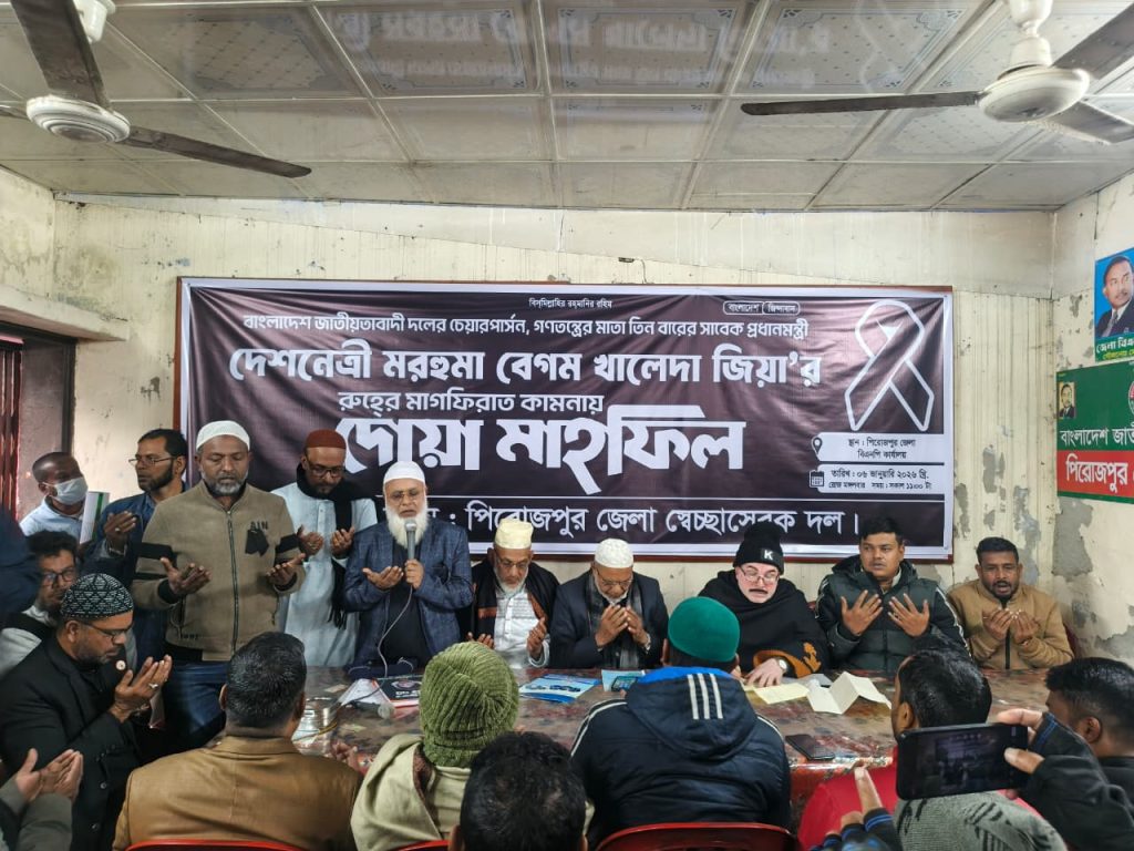 পিরোজপুরে জেলা স্বেচ্ছাসেবক দলের আয়োজনে খালেদা জিয়ার রুহের মাগফিরাত কামনায় দোয়া মাহফিল